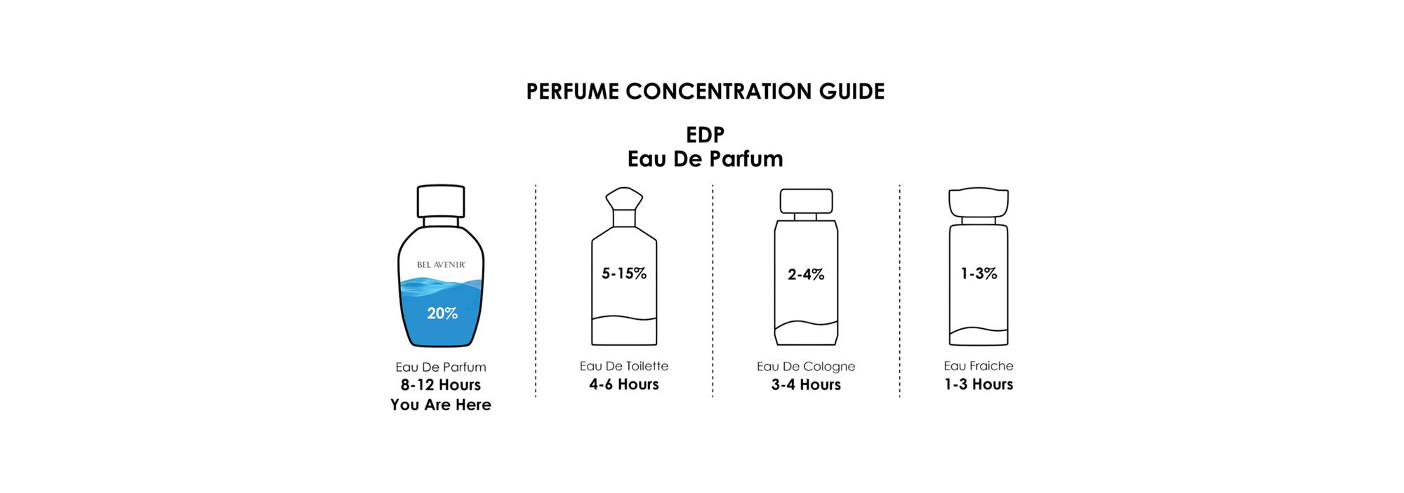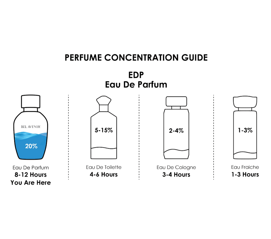 All Bel Avenir fragrances are formulated as Eau de Parfum, meaning they contain a high concentration of premium fragrance oils. You can expect our scents to last beautifully on the skin for [e.g., 6 to 8+ hours], and even longer on clothing. Keep in mind that base notes like Oud, Amber, and Musk naturally linger the longest!